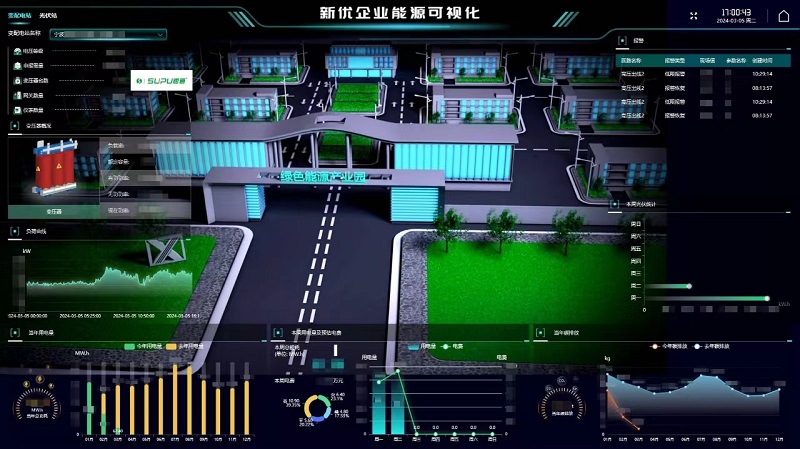 數據:為該公司定制了企業級的能源數字可視化大屏,通過大屏,該企業可以直觀的看到廠區的變壓器實時情況以及年度同比用電趨勢及光伏發電量。