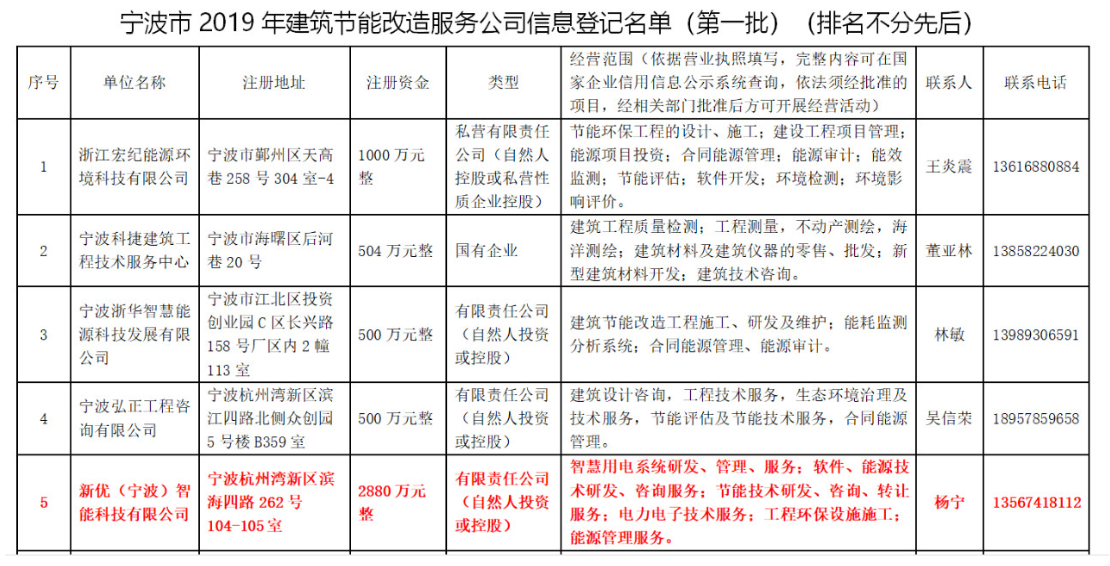 為推進寧波市企事業(yè)節(jié)能改造項目,加強能源項目管控,提升綠色運營能效水平,促進寧波市高能耗的節(jié)能改造進程,進一步推廣合同能源管理,搭建節(jié)能信息溝通橋梁,寧波市住房和城鄉(xiāng)建設(shè)局開展了2019年度寧波市節(jié)能服務(wù)公司征集評選工作,經(jīng)過專家審查,新優(yōu)(寧波)智能科技有限公司榮登2019年度寧波市民用建筑節(jié)能服務(wù)公司信息登記名單(第一批),在此表示熱烈的祝賀!